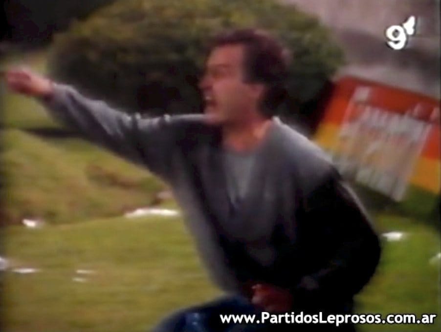 So it's to the 1992 Libertadores that, wanting to learn more about Bielsa, I've turned first; to a match from the journey, against San Lorenzo, a quarter-final first leg played at the stadium that now bears Bielsa's name. In 1992, from the limited view the cameras allow, I declare this ground a shed. Growing out of a bucolic green space amid a dense urban grid, the concrete bowl with one covered stand was informally known as The Colossus in the Park before Bielsa gave it a name; it has since been extended, with two precarious tiers perched atop the old terraces. San Lorenzo are met by a sort of controlled chaos, the pitch covered with streamers from the stands, while our man Bielsa spends the first half observing the match while standing in a dugout that disguises him from the belt down; from the belt up he's wearing a pullover with a deep-v collar over a t-shirt. (From the belt down, we see later, he's wearing baggy blue jeans.)